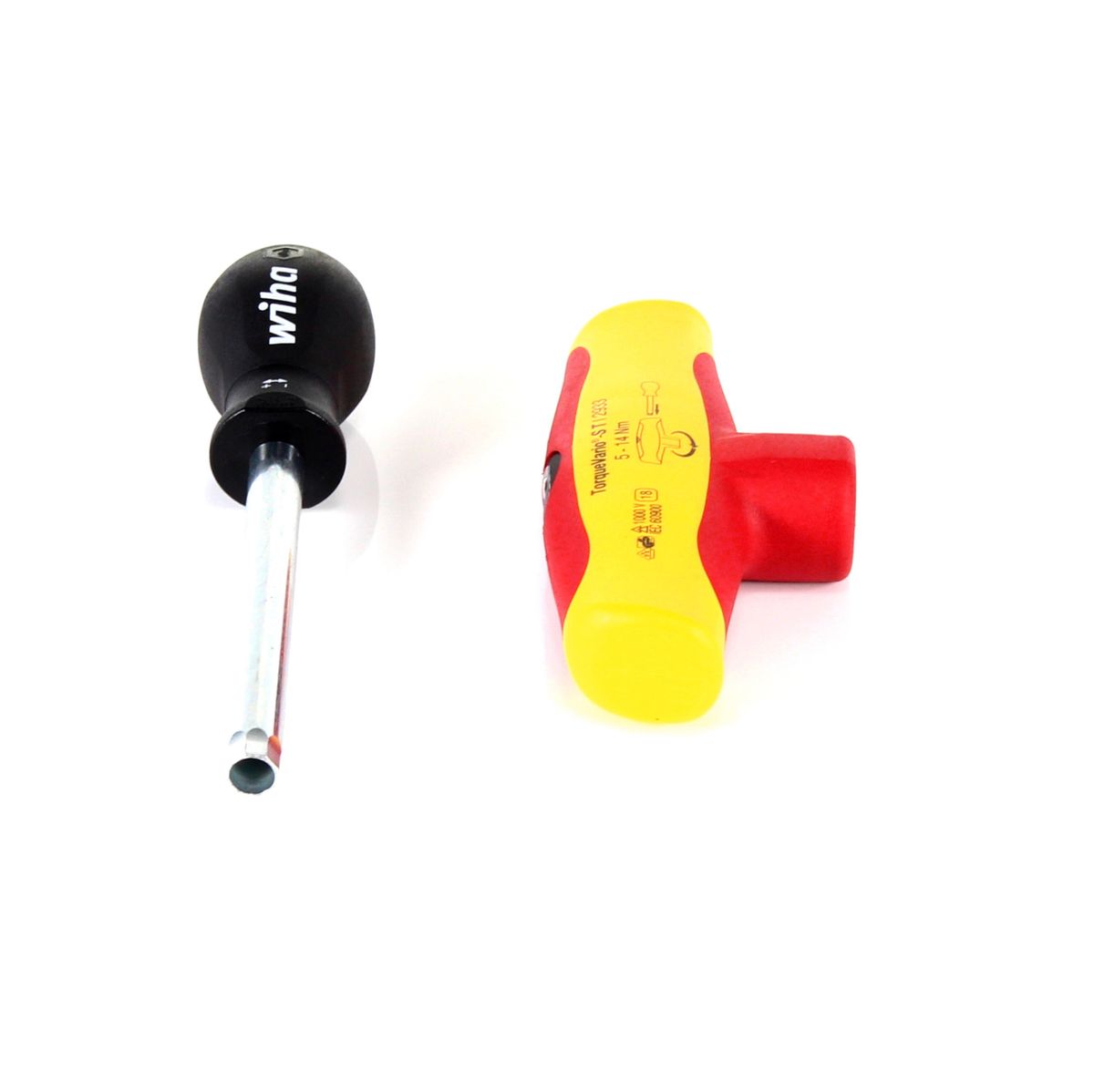 Le serrage de vis avec une valeur de couple définie supérieure à 5 Nm demande un effort important avec un tournevis dynamométrique normal. Le tournevis dynamométrique avec manche en T au réglage variable apporte la solution à ce problème. Avec une plage de réglage de 5 à 14 Nm et en combinaison avec les lames dynamométriques isolées pour manche en T, il couvre un large champ d'application. Pour le réglage d'une valeur de couple, le couvercle latéral doit être ouvert à l'aide d'une petite pièce de monnaie. L'outil de réglage fourni et de l'affichage Nm numérique permettent le réglage et la lecture aisée et rapide de la valeur de couple souhaitée. Un signal clairement audible et perceptible lors du déclenchement du couple garantit la sécurité de processus de la mécanique de la fonction dynamométrique qui protège des détériorations de matériau et permet d'éviter des retouches. L'accouplement à glissement intégré permet d'éviter le dépassement de la valeur de couple souhaitée. Avec une précision de déclenchement de +/- 6%, l'outil dynamométrique satisfait aux exigences de la norme DIN EN ISO 6789. En tant que produit certifié VDE & IEC, le tournevis dynamométrique avec manche en T est homologué pour les travaux sur des pièces sous tension jusqu'à 1 000 V AC et offre aux électriciens une protection maximale dans leur travail quotidien.